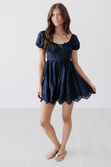 This navy mini dress is all about that flattering, feminine shape. The fitted bodice and puff sleeves create a structured feel, while the flared s...