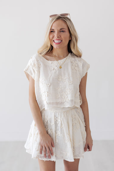 This top and skirt set is effortlessly feminine with its delicate floral texture and soft, flowy shape. The cropped top pairs perfectly with the f...