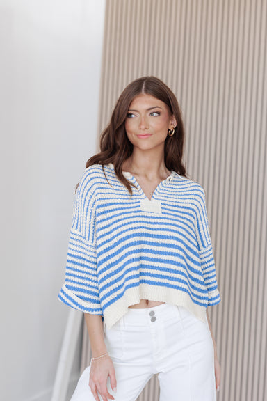This striped knit top brings a relaxed, coastal feel with its airy texture and easy, draped fit. The cropped length and loose sleeves give it a la...