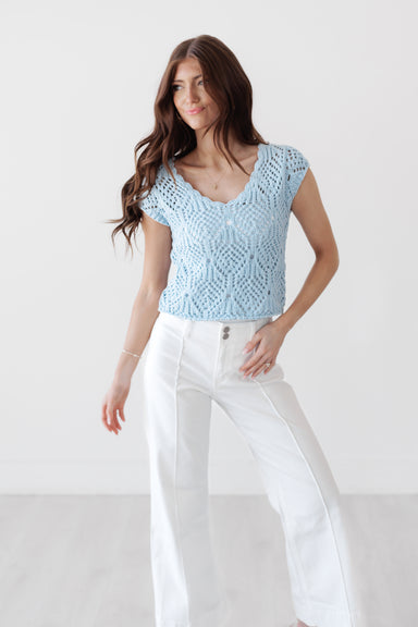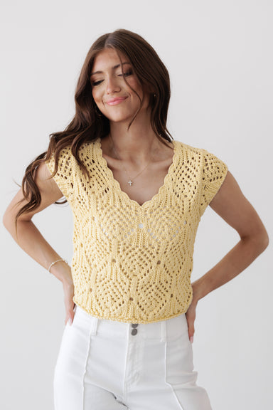 This crochet knit top adds soft texture and a feminine touch with its delicate openwork design and scalloped neckline. The slightly croppe...