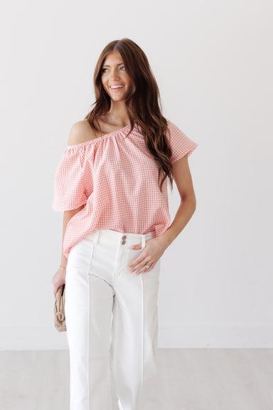 This gingham top brings a classic, feminine feel with its soft pink check print and breezy silhouette. Designed with a relaxed fit and flutter sle...