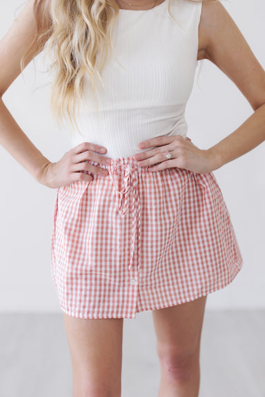 This gingham skirt brings a playful, feminine feel with its classic check print and easy pull-on design. The lightweight fabric and adjustable dra...