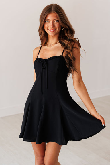 The Danielle Dress is the ultimate "mysterious but approachable" ensemble, featuring a deep black fabric brought to life by a delicate, sprawling f...