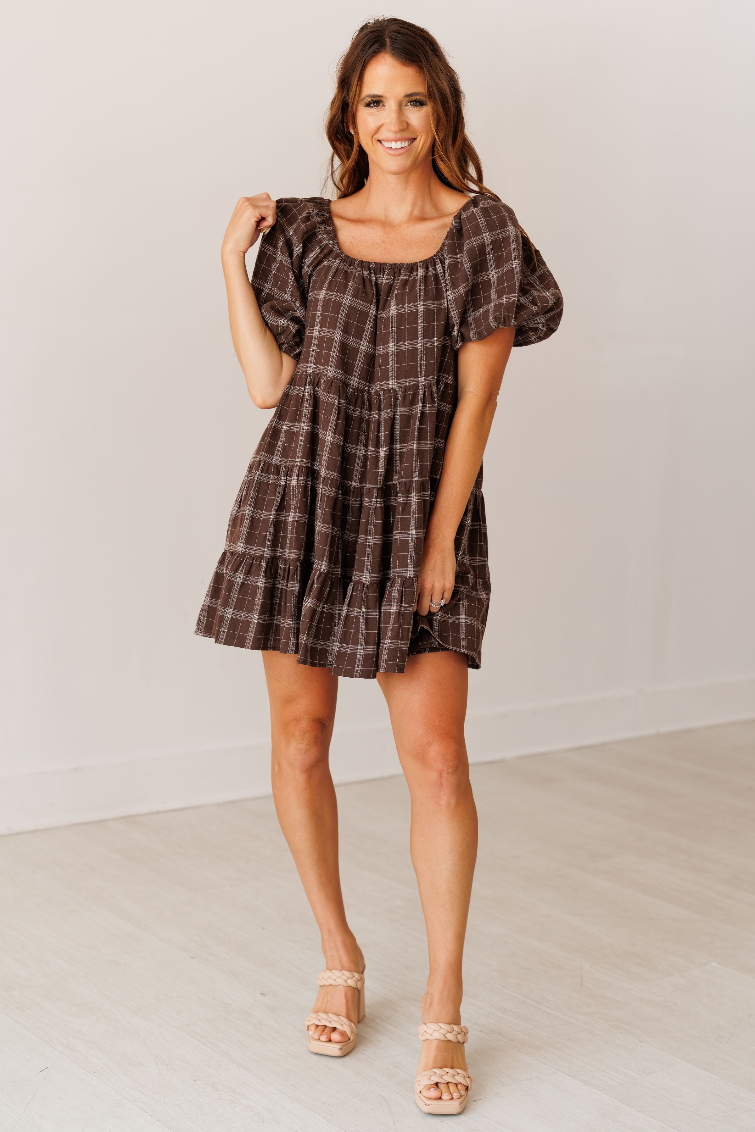Twirl into elegance with the Chloe Dress in brown, featuring delicate floral stitching that adds a touch of whimsy to your wardrobe. The charming r...