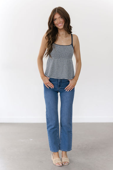 The Rise And Move Top is the ultimate "I’m on vacation" mindset in shirt form, featuring classic horizontal white stripes against a deep navy backd...
