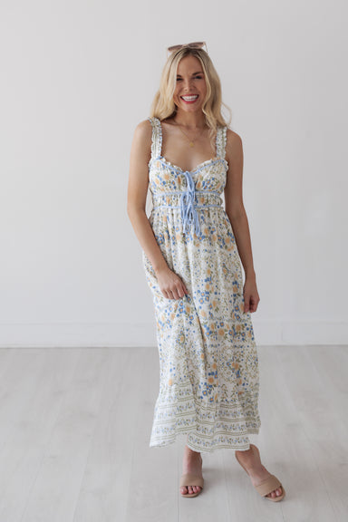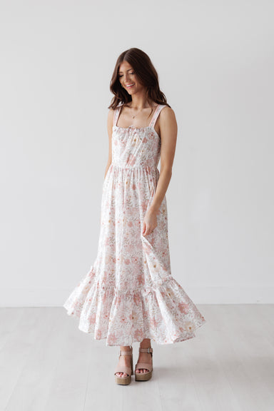 This floral maxi dress features a soft, flowy silhouette with a feminine gathered neckline and adjustable tie detail. The tiered skirt adds moveme...