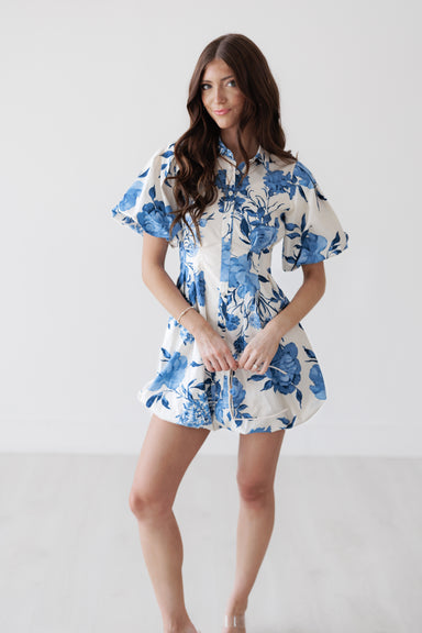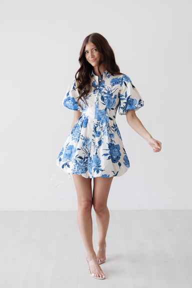 This floral mini dress features a structured silhouette with a flattering cinched waist and voluminous puff sleeves. The button-front detail and s...