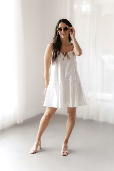 Meet the Kira Mini Dress that’s basically a permission slip to relax. With its playful drop-waist ruffle and charming tie-front detail plus adjus...