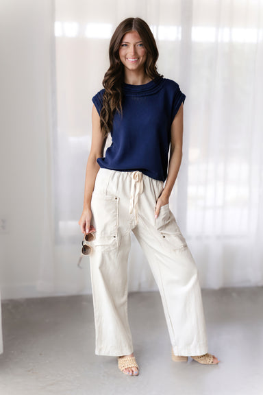 Meet Chase The Horizon Sweater Top- navy knit vest is the ultimate "I have my life together" piece, even if you’re just wearing it to run for ice...