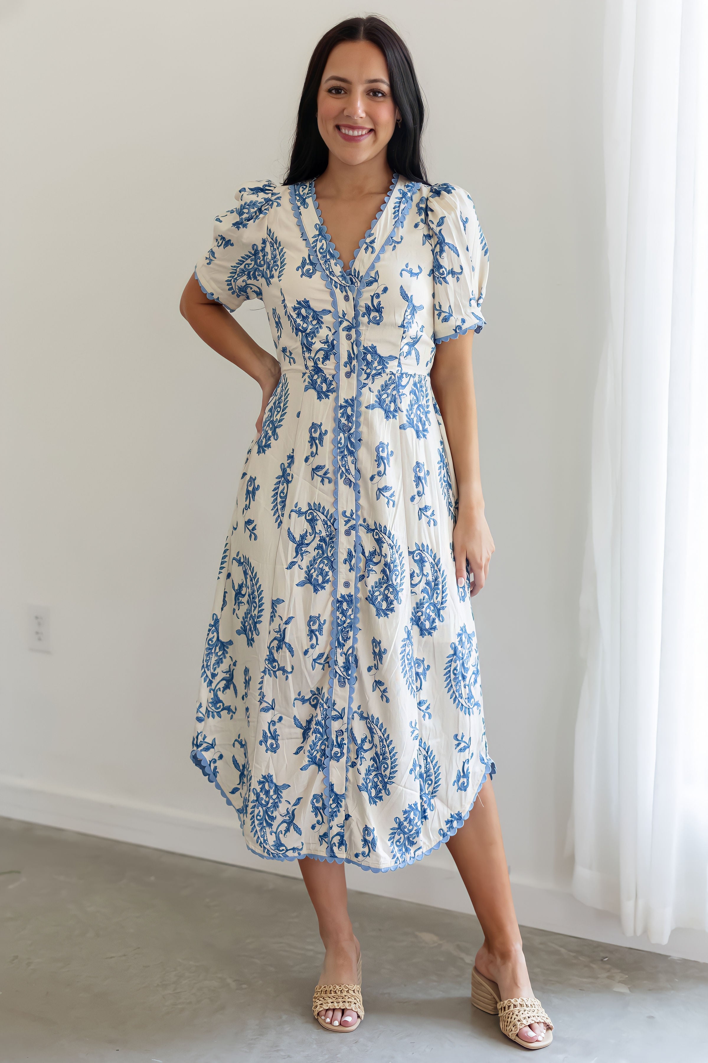 This Madison dress is covered in delicate blue floral embroidery, it’s the perfect choice for looking like a refined cottagecore icon while secre...