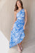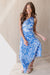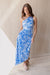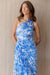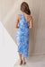 The Shelly Dress commands attention at your next summer event with this striking one-shoulder maxi dress, a perfect blend of modern silhouette and timeless floral charm. Rendered in a brilliant azure and white botanical print, the dress features an elegant asymmetrical neckline and a daring side cut-out at the waist. The fabric is artfully pleated and draped across the bodice, flowing into a cascading, floor-length skirt that offers beautiful movement with every step.