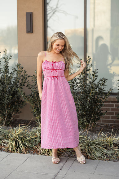 Master the art of chic with this darling red and white gingham maxi dress. Designed with a feminine waist and bow accents down the bodice, it’s t...