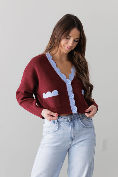 This maroon cardigan features charming baby blue trim detailing and a playful ruffle-style button-down front that adds movement and personality to ...