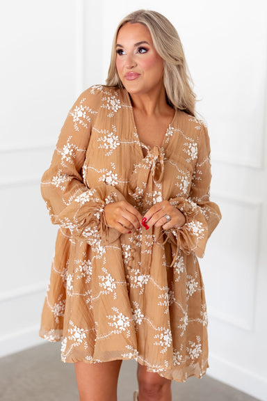 Prepare to charm in the "Audrey Dress!" You can never go wrong with a chic and charming sweater dress like this one! Featuring a neutral brown knit...