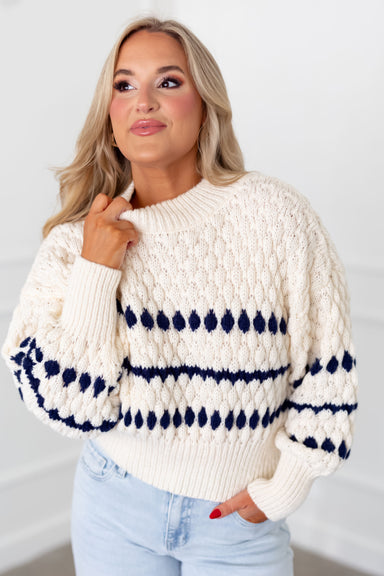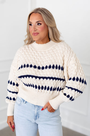 Prepare to charm in the new “First Light Sweater!” This trendy sweater top is the perfect addition to your fall wardrobe! It features a neutral ivo...