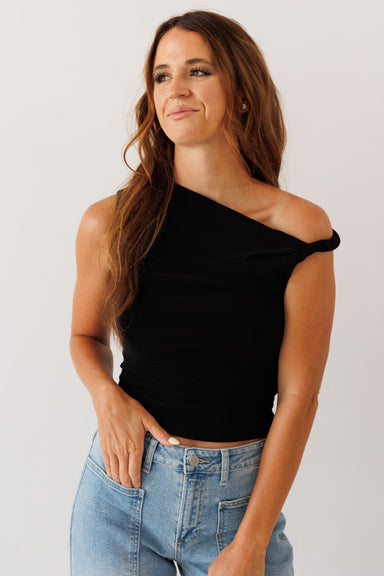 This fitted cropped top features an elegant off-shoulder silhouette with a brown string tie detail at the chest, creating a refined and versatile p...