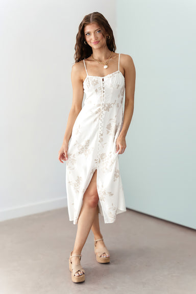 The Addison Dress features a delicate tan floral print, offering a sophisticated and romantic aesthetic for warm-weather occasions. It is designe...