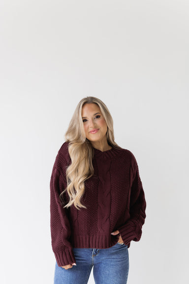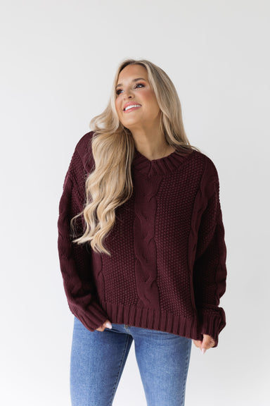 Wrap yourself in the warmth of this burgundy cable knit sweater, crafted with a chunky knit construction that delivers both comfort and timeless st...