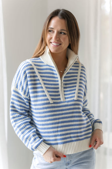 Hit the slopes or cozy up by the fire in this striped pullover half-zip sweater that screams alpine adventure. The classic blue and white stripes p...