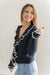 Wrap yourself in cozy charm with this super soft black cable knit cardigan, complete with crisp white trim and an adorable flowy ruffle detail running down the front. It's the perfect piece to layer over your favorite outfits while keeping things effortlessly chic and undeniably cute. Whether you're heading out or settling in, this sweater is your new go-to for comfort that doesn't compromise on style.