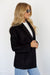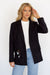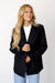 Sophisticated and versatile, the new "Dusk Horizon Blazer" is designed with a single-button closure for a clean, modern finish! The relaxed, oversized fit offers effortless layering over everything from blouses to knits. Crafted from a sleek woven fabric, it drapes beautifully while maintaining a polished silhouette. Functional details and a timeless black hue make it a wardrobe staple. Perfect for dressing up denim or completing a professional ensemble!