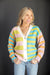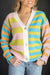 - Why choose one color when you can wear all the colors? This vibrant, button-down cardigan flips the script on traditional stripes with a bold, color- block design that’s impossible to ignore. It’s the sartorial equivalent of a double rainbow—guaranteed to brighten your mood and make you the brightest person in every room!