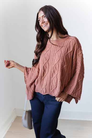 Drench your wardrobe in the rich, warm tones of autumn with this beautiful cable knit sweater that feels like a warm hug. It features an intricate,...