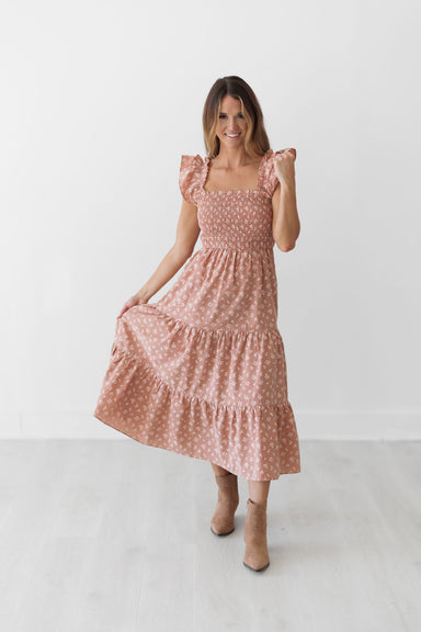 This rust-colored floral maxi dress is the perfect blend of effortless romance and bohemian charm! The "Alina Dress" features soft tiered ruffles ...