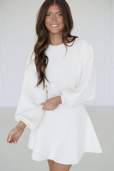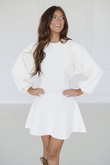 There is no doubt that the "Sherwood Dress" is perfect for the fall season. This mini dress is perfectly cream colored with feminine bubble sleeves...