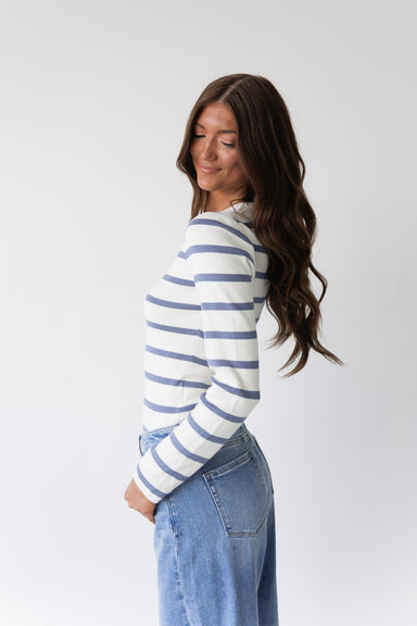 Embrace effortless coastal elegance with this fitted ivory bodysuit, featuring timeless blue stripes and thoughtfully designed long sleeves for mod...
