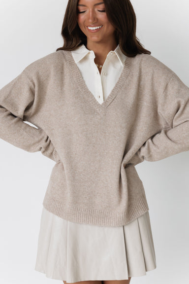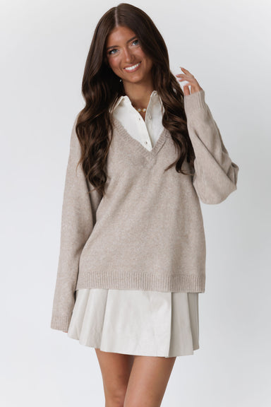 This versatile tan sweater top seamlessly layers a crisp white built in collar, creating an effortlessly polished look. The V-neck design adds refi...