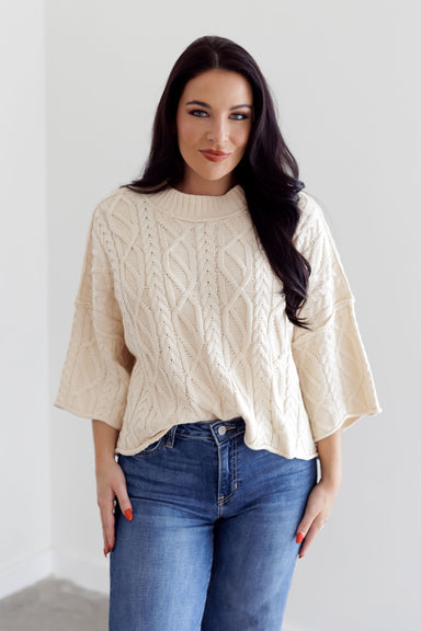 Stay warm in the "Winter Retreat Sweater!" We love the elevated details that this cozy sweater has to offer! It features a classic cable knit desig...