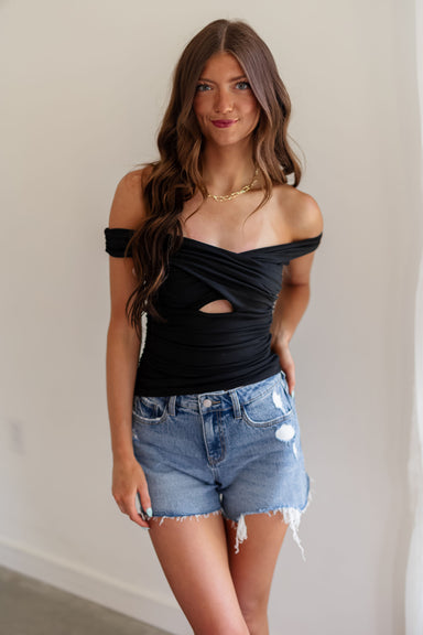 Turn heads in this flirty off-shoulder top that strikes the perfect balance between bold and wearable. Cinched sleeves add a touch of playful charm...