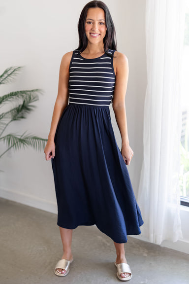 You are going to love the "Anita Dress" in blue stripe! This elevated dress is truly perfect for any upcoming vacation! Adorned with self tie strap...