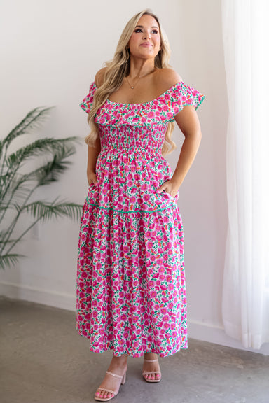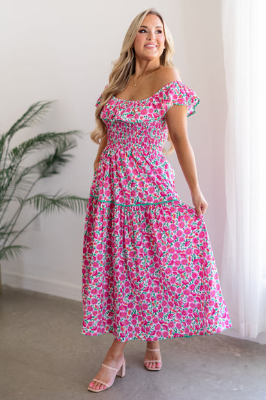 Twirl around in the "Carson Dress!" An easy way to make a stylish statement, this dress is effortlessly chic and feminine! It boasts a fully smocke...