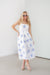 The Adaline Dress adds a touch of tropical elegance to the summer collection. The dress is crafted from a crisp white fabric with tonal vertical striping and features a bold, embroidered palm leaf motif in a deep navy blue. It is designed with a modern square neckline and dainty adjustable spaghetti straps. The flowing skirt provides a relaxed yet refined silhouette that is perfectly complemented by the collection's neutral platform sandals and chic sunglasses.