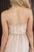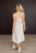 The Faye Dress features intricate vertical white embroidery and lace-like motifs that elongate the frame, complemented by a ruffled sweetheart neckline with a dainty tie-front detail. Thin adjustable straps and a flowy skirt with hidden side pockets ensure this dress is as functional as it is romantic. It serves as a stunning neutral anchor for the "Western Romance" edit, embodying a soft, prairie-inspired aesthetic.