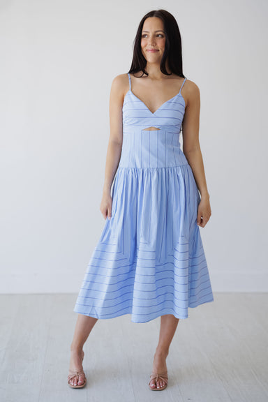Introducing the "Victoria Dress!" This powder blue sundress features a stylish navy pinstripe pattern and a distinctive front twist de...