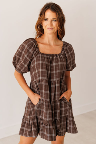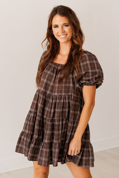 Prepare to charm in the "Katya Dress!" Effortlessly versatile, this mini dress is perfect for elevating your everyday style! Boasting a brown base,...