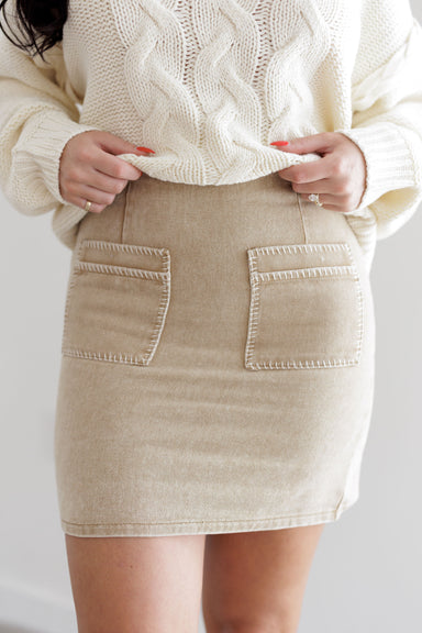 Turn heads in the "Simply You Mini Skirt!" Boasting an ash taupe colored fabric, contrast stitching on the front pockets, and a zip up back for clo...