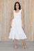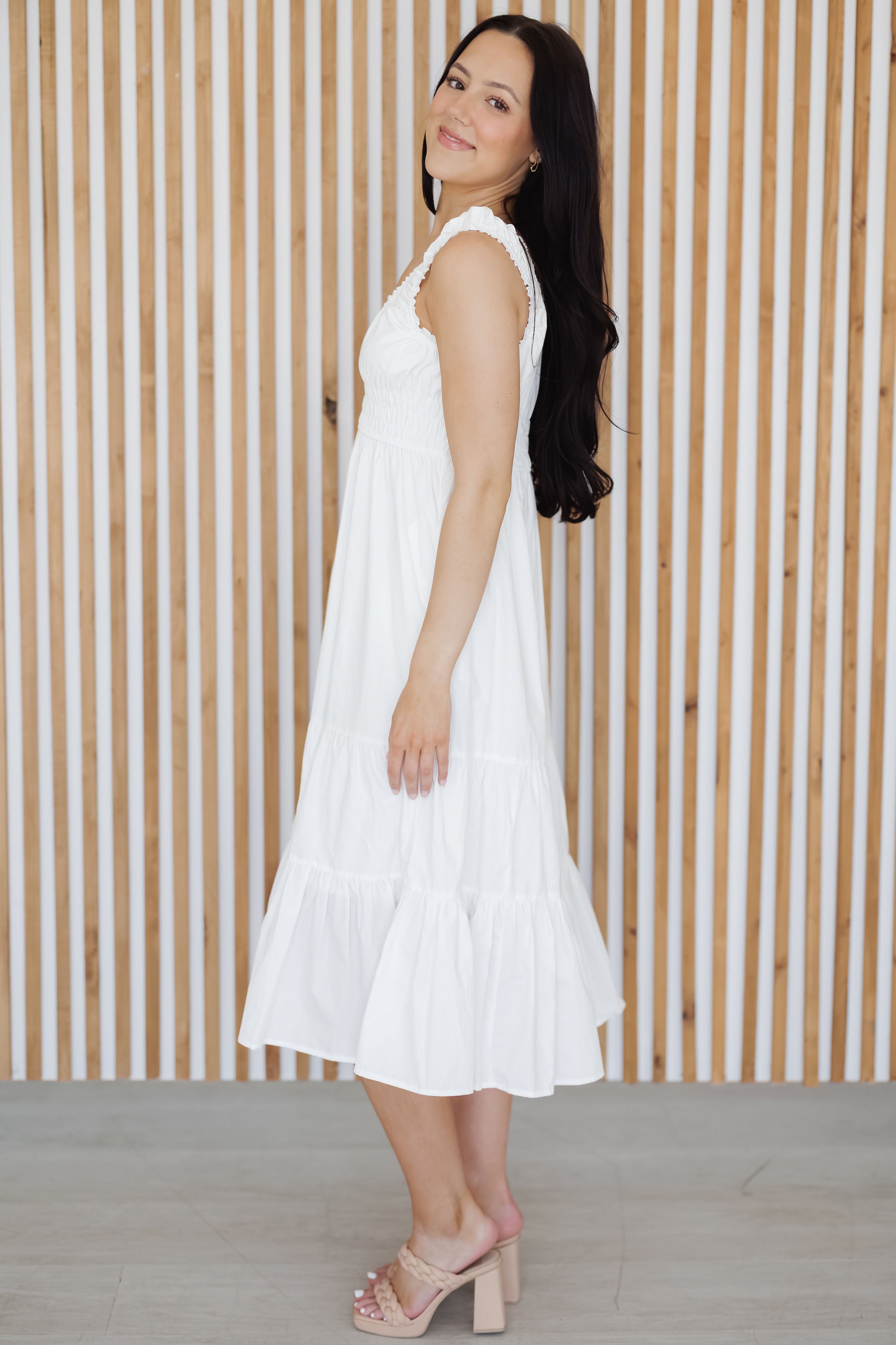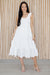 The "Megan Dress" features a feminine gathered neckline, comfortable elastic waist, and tiered ruffle hem for a touch of romance! Crafted from lightweight cotton, it offers breathable comfort perfect for warm summer days while its versatile design easily transitions from casual daytime outings to evening gatherings. The sleeveless silhouette showcases a flattering A-line cut that skims the body beautifully, complemented by delicate elastic gathering at the shoulders. Pair this effortless boho-inspired piece with sandals and a straw hat for beachside strolls or dress it up with accessories for a charming garden party look.