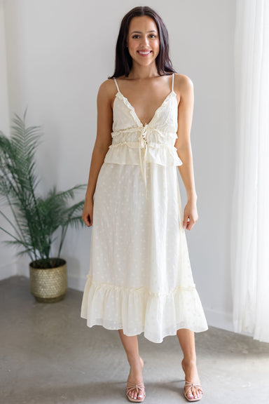 Twirl around in the new "Stephanie Dress" in an cream floral combo! Featuring short capped sleeves, a soft v-neckline, and a tiered ruffle midi ski...