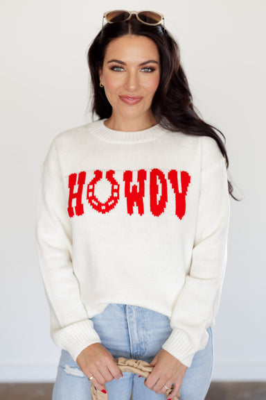 Playful and cozy, this knit sweater features a horseshoe graphic with “Howdy” text for a fun, western-inspired touch! Crafted from soft knit fabric...