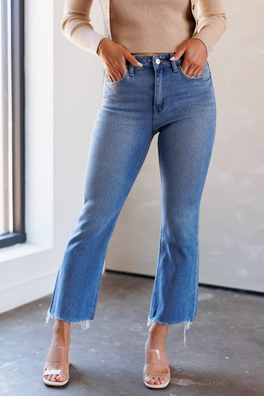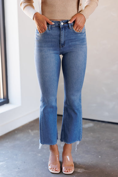 Introducing the "Darrion Mid Rise Crop Flare Jeans!" These jeans are the perfect addition to your wardrobe! Whether you're heading back to school, ...