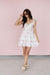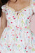 The Brianna Dress, the carefree beauty of a summer meadow with this enchanting fit-and-flare mini dress. Featuring a delicate wildflower print in shades of pink, yellow, and blue against a crisp white background, this dress is detailed with charming ruffle straps and a feminine sweetheart neckline. The bodice includes a dainty tie-front accent and intricate lace-trim borders, leading into a tiered, flouncy skirt with a scalloped eyelet hem.
