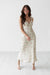 The Ciara Dress, featuring a dainty pink floral print over a subtle sage-green backdrop. The dress is designed with a flattering V-neckline detailed with a delicate ruffle trim and a dainty tie at the center bust. Its slender spaghetti straps and flowing skirt create a graceful, slip-style silhouette that moves beautifully. Styled here with clear-heeled sandals, this dress is an ideal choice for garden parties, bridal showers, or romantic summer dinners.