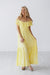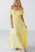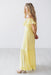 The Tiffany Dress, featured in a soft buttery yellow. This piece is defined by its romantic ruffled neckline and a smocked bodice that provides a comfortable, figure-hugging fit through the waist. The tiered skirt is accented with delicate lace inserts, adding a touch of artisanal texture to the flowing hemline.
