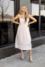 The Zoe dress is a masterclass in subtle, feminine detailing, perfect for a summer garden party or an elevated daytime event. Rendered in a soft blush pink and white pinstripe, it features a structured bodice with a sweetheart neckline and delicate lace-trim inserts that run vertically along the front. The adjustable spaghetti straps lead to a graceful midi skirt, accented with a unique horizontal eyelet lace band near the hem for added texture and charm.