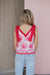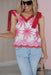 The Spring Fever Top, featuring a creamy white base adorned with vibrant pink floral embroidery. The top is defined by its playful, oversized tie-shoulder straps in a contrasting red-and-white micro-check pattern, adding a whimsical touch to the silhouette. Intricate scalloped edging along the neckline and hem provides a refined, handcrafted feel.