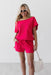 The Take The Chance Shorts is a set that features a relaxed-fit top with a wide, raw-edge neckline designed to be worn effortlessly off one shoulder. Crafted from a soft, saturated candy red, the top is paired with coordinating lounge shorts that feature a comfortable elasticated waistband and an adjustable drawstring tie. This set balances a bold, modern hue with a relaxed silhouette, making it an ideal choice for elevated at-home lounging or casual summer outings.